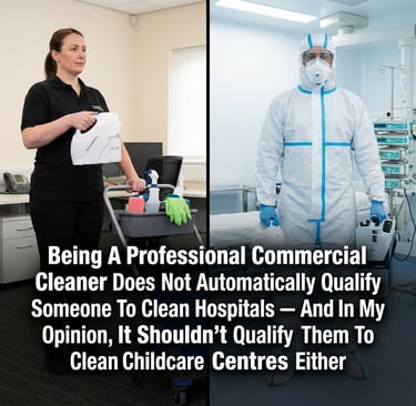 Being a “professional cleaner” isn’t enough for childcare. Just like hospital cleaning, childcare cleaning requires specialist protocols, documentation, and an understanding of infection control and the NQF.
