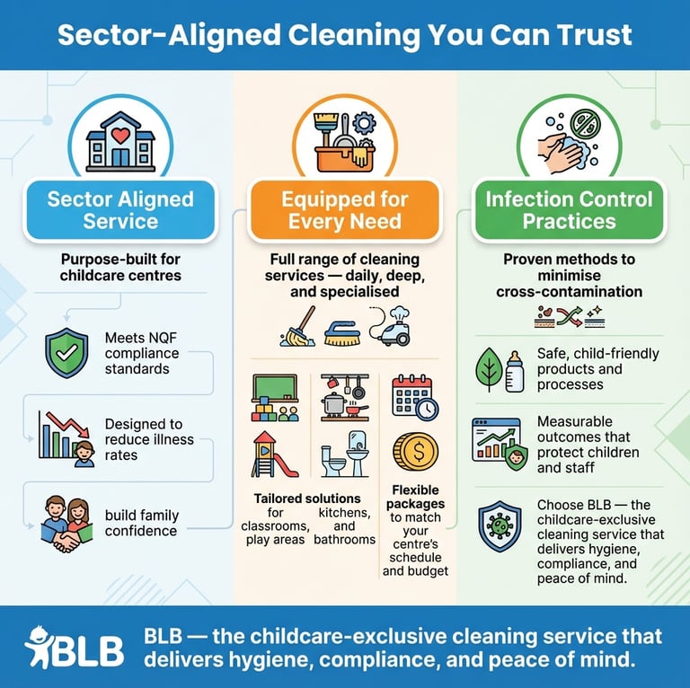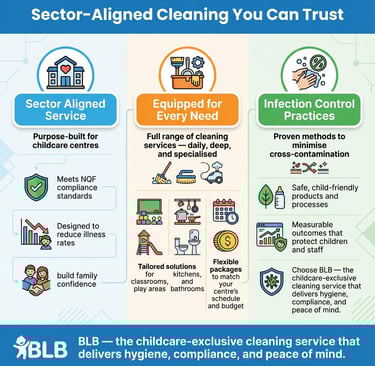 Welcome to the BLB Childcare Cleaning blog — a space dedicated to elevating cleaning standards in early learning environments. Here you’ll find insights, practical strategies, and sector‑aligned resources designed to help directors, educators, and cleaners work together to achieve better outcomes under NQF Area 2: Children’s Health and Safety.