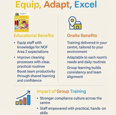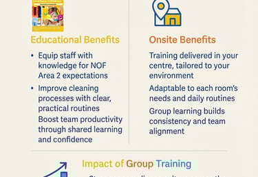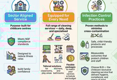 In addition to routine cleaning, we offer a range of specialised services that can be scheduled into your 12-month cleaning program or booked as one-off service—flexible, professional, and tailored to your centre’s needs.