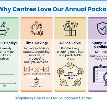 Sector-Specific Training and Protocols: Staff training and cleaning protocols specifically designed to meet the unique needs of childcare centers, ensuring compliance with sector standards.