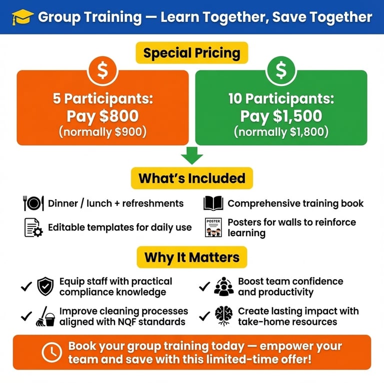 Course Objectives: Build smarter routines for better outcomes, tackle real centre challenges, identify improvement areas, and map clear paths forward. Equip childcare professionals with advanced infection control, compliance-based cleaning routines, and documentation skills. Participants will learn to prevent cross-contamination, manage outbreaks, align with NQF/NQS/ACECQA standards, and foster a culture of hygiene and safety within their centres.
